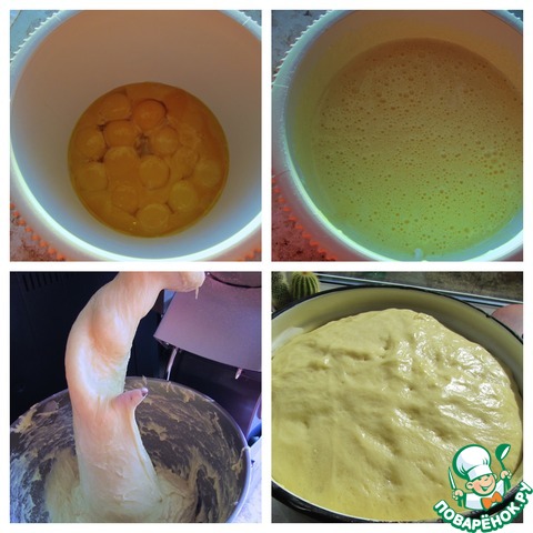 Желтки (все) взбить с 4 стаканами сахара до пышности, добавить сметану, соль. Перемешать миксером до смешивания всех ингредиентов. Эту смесь добавить к опаре, добавить просеянной муки около 12 стаканов, хорошо вымесить тесто руками, либо стационарным миксером насадкой "крюк". Это количество тесто я вымешивала частями: в 2 захода стационарным миксером насадкой для теста "крюк" и в 2 захода в ХП (каждая порция вымешивалась минимум 15 минут). Количество муки приведено примерное, возможно вам нужно будет добавить какое-то ее количество дополнительно, так как характеристики муки разные, желтки имеют разный вес. Вымешанное тесто положить в большую кастрюлю, накрыть пленкой и оставить для подъема и увеличения в 2-3 раза (около 2-х часов).
