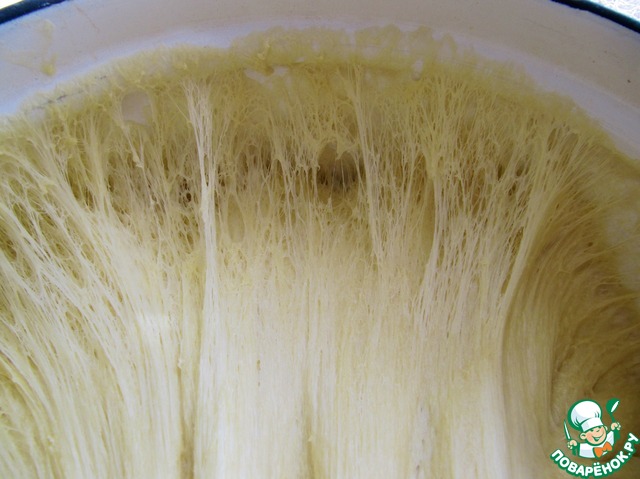 Мягкое сливочное масло "тающей" консистенции постепенно вмешать в подошедшее тесто руками до соединения всех составляющих, затем процесс вымешивание продолжить при помощи насадки "крюк" около 15 минут для каждой порции теста. Возможно, что на этом этапе прийдется добавить муки, если вымешиваете при помощи ХП - оценивайте колобок, к концу замена из него должен получиться шар, хорошо вращающийся в ведерке, следите, чтобы под колобком не было "лужи" из теста! При вымешивали насадкой "крюк" тесто должно собраться все вокруг крюка, на дне чаши не должно оставаться жидкого теста! Это важно. Хорошо вымешанное тесто - гладкое и эластичное. Готовое тесто оставить для подъема и увеличения в объеме в 2-3 раза (в теплом месте без сквозняков, накрыв пищевой пленкой или полотенцем). Вот так выглядит подошедшее тесто, при обминании оно делится как-бы тонкими нитками.