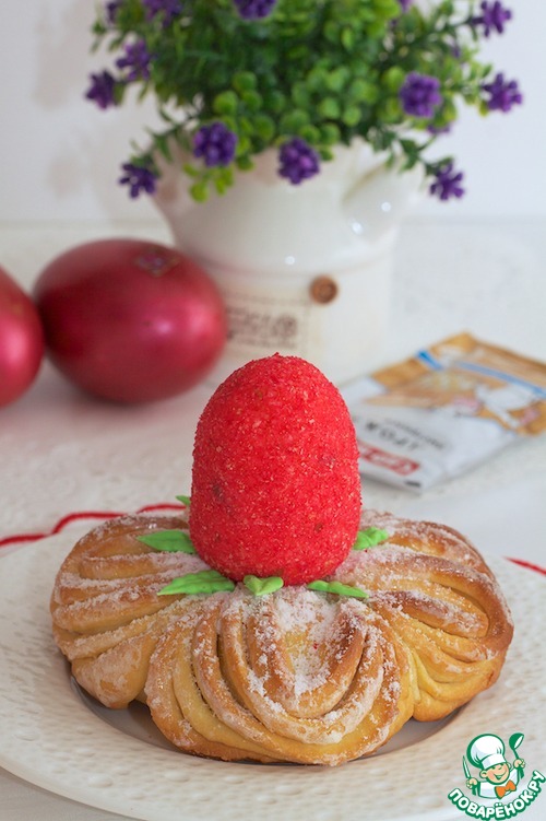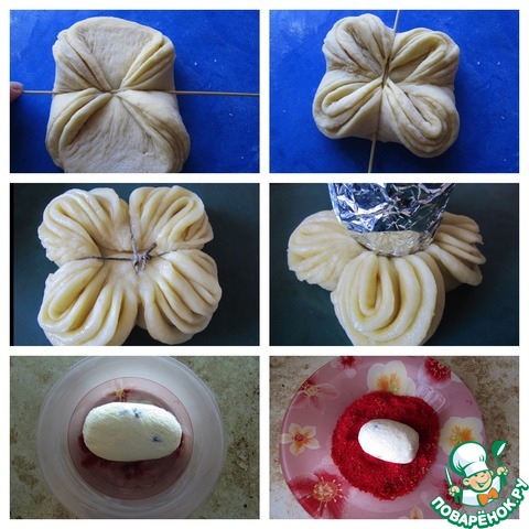 Одним из вариантов праздничной выпечки будет булочка-подставка под "крашеное яйцо" из творожной массы (аналог творожной Пасхи, рецепт вот http://www.povarenok .ru/recipes/show/749 23/). Для этого кусок сдобного теста вымешиваю с добавлением муки, чтобы текстура была поплотнее, делю на 4-5 кусочков, раскатываю лепешки размером с блюдце, каждый пласт теста смазываю маслом (сливочным растопленным или растительным без запаха). Формирую как указано на фото, скрепляю кулинарной нитью, чтобы при выпекания форма не развалилась, на время расстойки теста ставлю сверху рюмку, обернутую фольгой, как только тесто немного "схватится" в духовке, конструкцию можно будет убрать, выпекать до готовности. "Крашеное яйцо" формирую из творожной массы по рецепту творожной Пасхи, заворачиваю в пищевую пленку и кладу в холодильную камеру до застывания сливочного масла. Предварительно испеченный с красным пищевым красителем маленький куличик разрезаю на кусочки, высушиваю в духовке, измельчаю в блендере до состояния крошки, обваливаю "яйцо" в крошке. Перед подачей на стол собираю угощение, булочку можно посыпать сахарной пудрой или еще горячую смазать горячим сахарным сиропом, она будет блестеть.