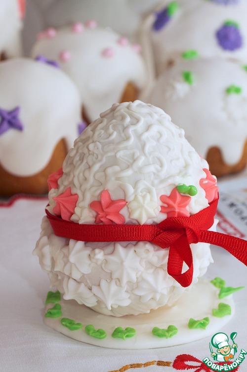 Для юной леди я приготовила угощение "яйцо-в-яйце", наружное "яйцо" состоит из двух половинок выпеченного теста, как киндер, покрытых сверху белковой глазурью и украшенных айсингом. Вареное яйцо смазать растительным маслом и закрепить при помощи фольги в форме для выпечки, сверху обернуть тестом (предварительно вымешанным сдобным тестом с добавлением муки), хорошенько закрепить, выпечь и полностью охладить, покрыть глазурью, затем украсить айсингом по-своему вкусу. Рецепт айсинга тут: http://www.povarenok .ru/recipes/show/581 33/. Внутри находится творожное "яйцо" (приготовленное аналогично, смотри шаг 8), которое предварительно обваляла в кондитерской присыпке для куличей. (часть фото шагов сделать забыла, так как отвлеклась!).