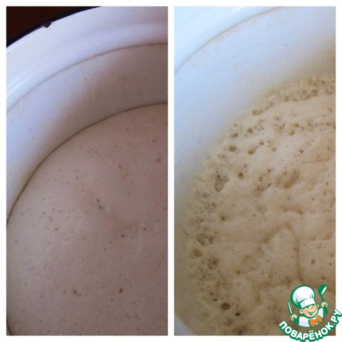 Заваренную и охлажденную до теплого состояния мучную смесь смешать с активизированными дрожжами, всыпать 1/2 стакана сахара (от общего количества), размешать, накрыть пленкой и поставить в теплое место до подъема (около часа), удобнее использовать 7-л кастрюлю. Опара должна "бродить" до тех пор, пока не станет опадать. На фото виден момент, когда опара вызрела и начала опадать.