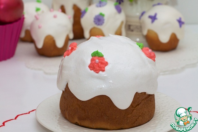 Для приготовления белковой глазури использую рецепт Ирушеньки: взбить 2 белка до "мягких" пиков, продолжая взбивание добавлять по 1 ст ложке сахарной пудры (всего 300 г), в середине взбивания добавить 1 ч л лимонного сока. Глазурь быстро сохнет, ровно ложится!