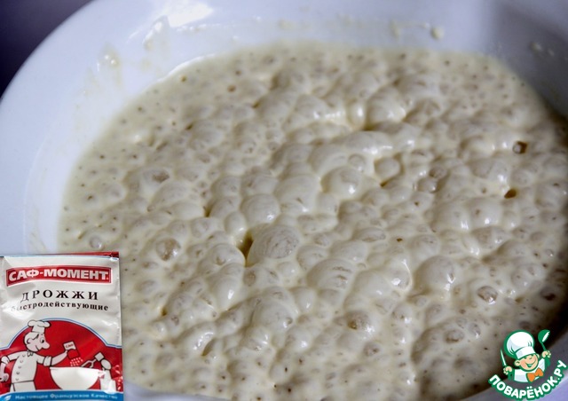 100 г муки, 100 мл теплого молока и дрожжи хорошенько взболтать вилкой, накрыть пленкой и оставить подходить в теплом месте минут 30.