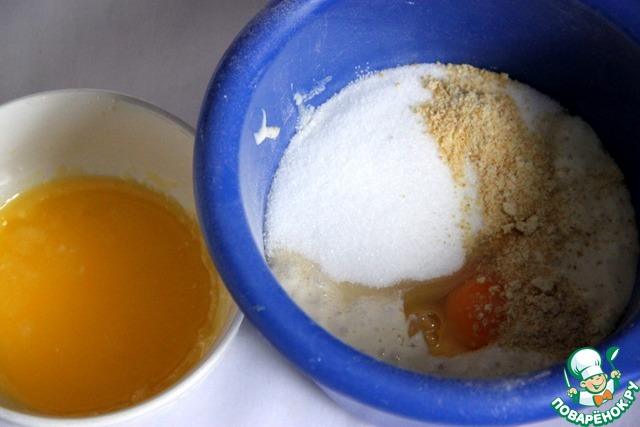 и добавить в посуду для взбивания, а желток - отложить для смазывания выпечки, для конечного этапа.