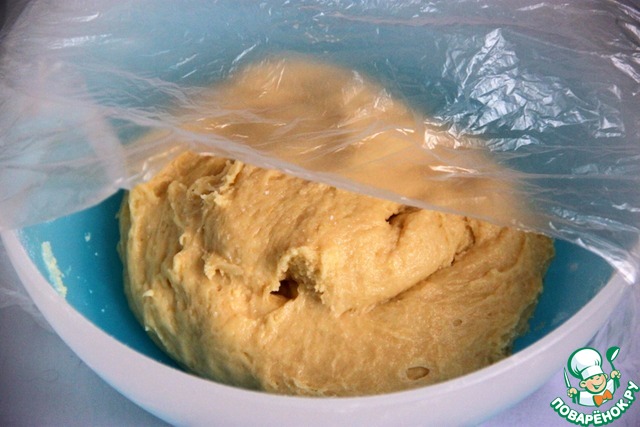 Тесто поместить под пленку и отправить в теплое место для подъема, часа на 2-4. (В теплой духовке - ок. 1 часа)