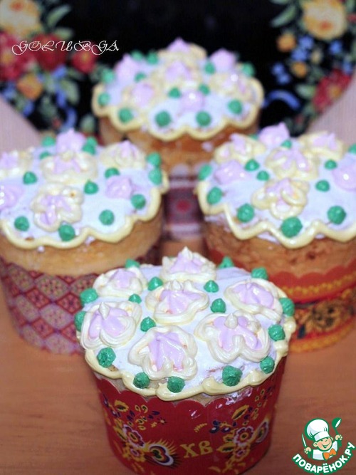 В это время можно приготовить глазурь (1 яичный белок + сахарная пудра + 1 ч. л. сока лимона, взбиваем все миксером до густой консистенции). Остывшие куличи смазываем приготовленной глазурью, а сверху присыпаем разноцветной кондитерской присыпкой!