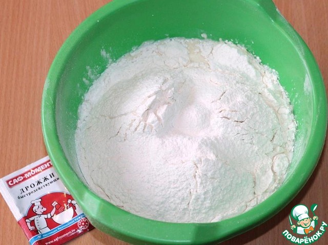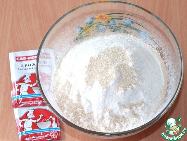 Приготовим опару. Просеянную муку 500 г смешать с сухими дрожжами.