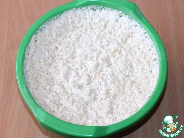 Добавить 500 г муки и хорошо размешать. Накрыть опару полотенцем и поставить в теплое место ~30 минут. Опара должна увеличиться вдвое. Я поставила в немного прогретую микроволновку.
