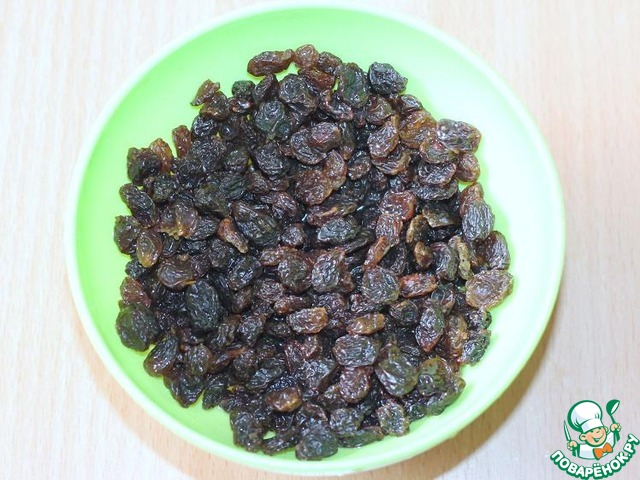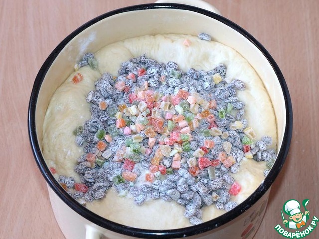 Замочить изюм в теплой воде на 15 минут, затем воду слить. Изюм обсушить, обвалять в муке вместе с цукатами