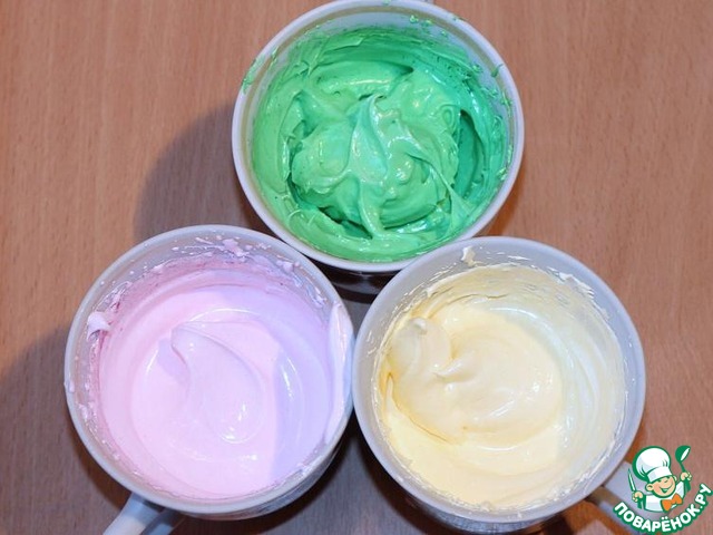 Я украшала куличи разноцветной меренгой. Взбила белки с сахаром + пищевым красителем до пиков и украсила куличи с помощью корнетика.