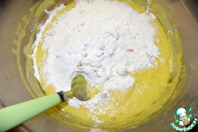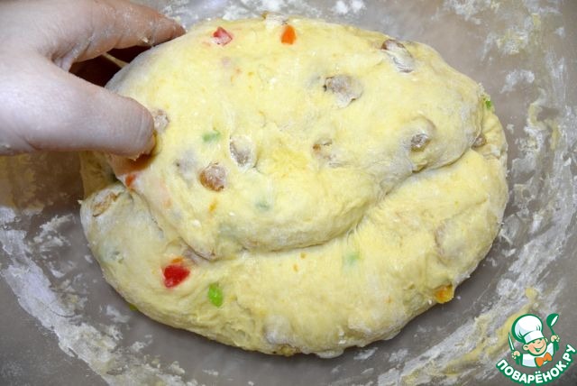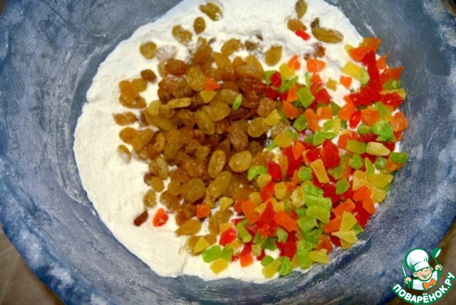 В оставшуюся муку всыпать предварительно промытый и обсушенный изюм. Можно половину заменить цукатами. Перемешать.