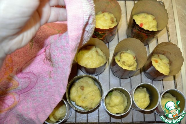 Подошедшее тесто еще раз вымесить на столе, разделить на кусочки и разложить по формочкам. Тесто должно заполнять 1/3 формы. Накрыть полотенцем и дать хорошо подняться.