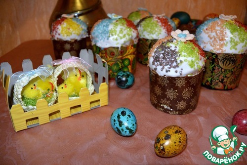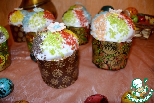 Обмазать куличи и посыпать присыпкой или крашеным сахаром. Я еще сверху украсила цветочками из сахарной мастики.