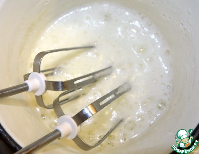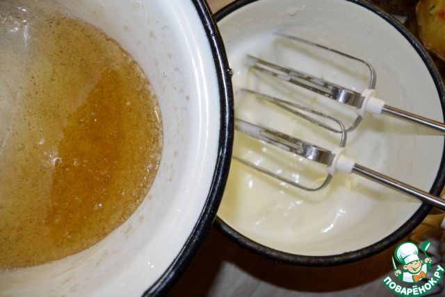 Не прекращая взбивания вливать тонкой струйкой кипящий сироп. Взбить до крепких пиков, в конце добавить щепотку лимонной кислоты.