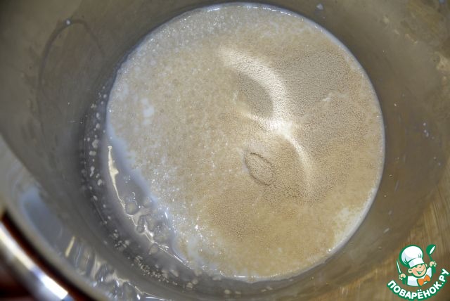 В теплые сливки добавить чайную ложку сахара и чайную ложку муки, взболтать и всыпать дрожжи.