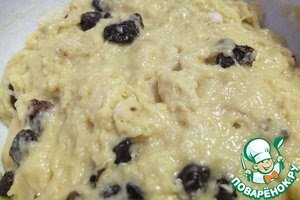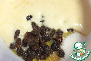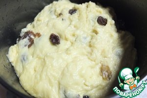 Добавить в тесто изюм, сахар, ликер, перемешать.