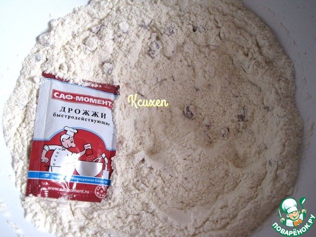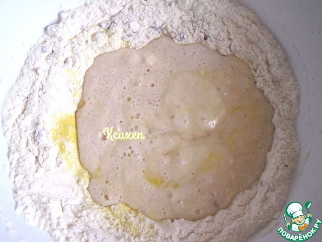 Для теста: смешаем в тёплом молоке дрожжи, по горсти сахара и муки. Накроем и оставим в тёплом месте до появления пенной шапочки (на 20-30 минут)