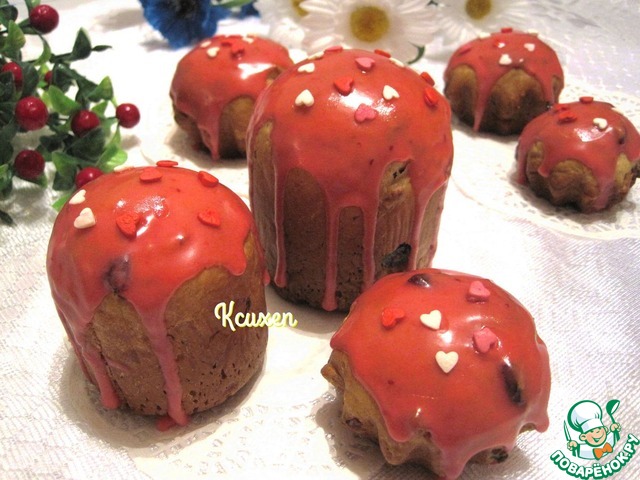 На остывшие куличики наносим глазурь и сразу декорируем, пока глазурь не начала подсыхать.