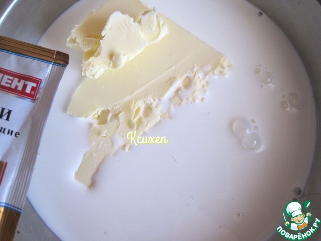 Для теста: 160 грамм сливок, 50 грамм сахара и сливочное масло прогреем в сотейнике до растворения масла и сахара. Кипятить не нужно! Дадим смеси остыть до тёплой t. Добавим ванильный сахар.