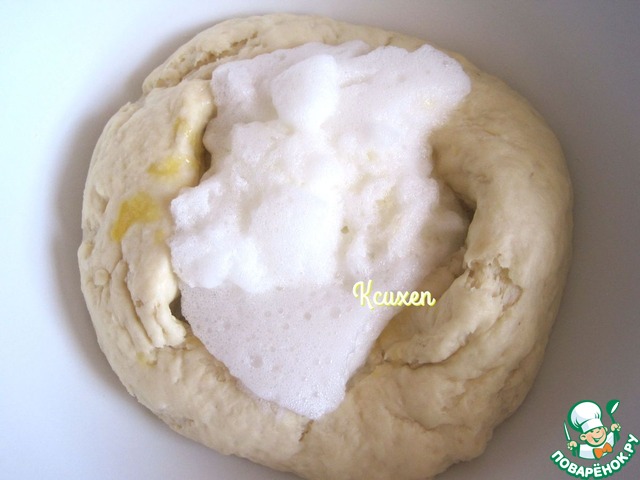 Отделим желтки от белков. Желтки взобьём с добавлением 50 грамм сахара. Белки взобьём в пышную пену. Вмешаем всё в тесто.