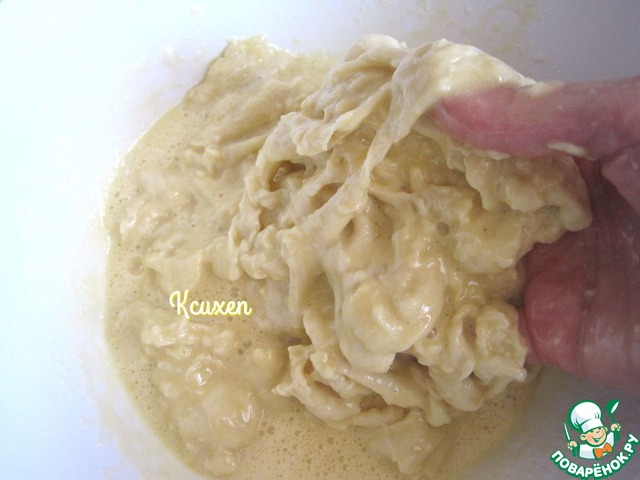 Послушное тесто превратилось в непослушную жидкую массу и вот здесь я добавила ещё 50 грамм муки. Возможно кому-то понадобится большее количество муки, но я сознательно оставила тесто жидким, даже текучим, не держащим форму и липким.
