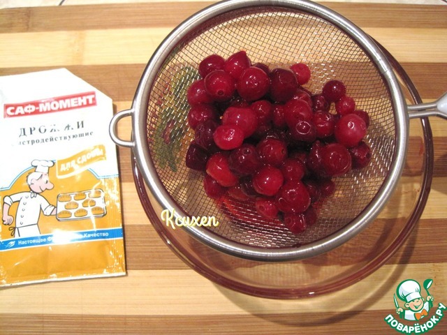 Оставшиеся сливки (40 грамм) немного подогреем, добавим дрожжи. Накроем и оставим в тёплом месте до появления пенной шапочки (20-30 минут) Сушёную клюкву зальём коньяком, орехи крупно порубим.
