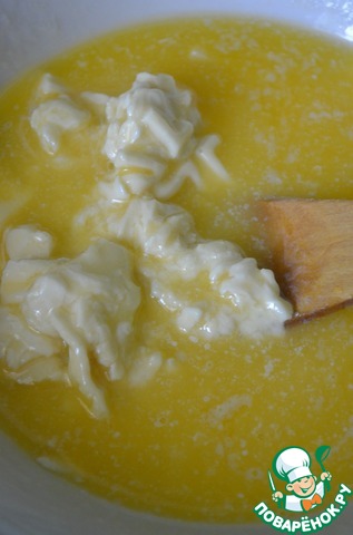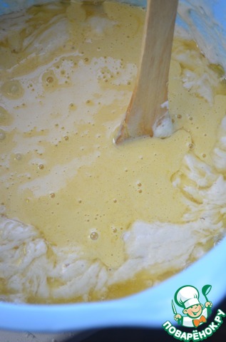 В подошедшее тесто добавить кусочки ананаса и коньяк.