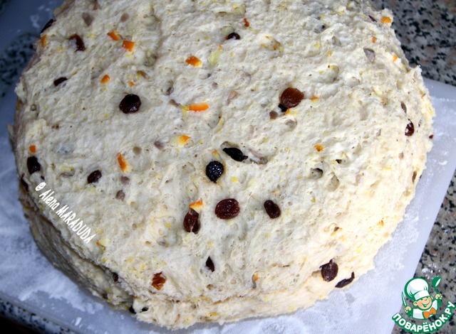 В поднявшееся тесто добавляем подготовленные добавки: апельсин, семечки подсолнуха и сухой изюм.