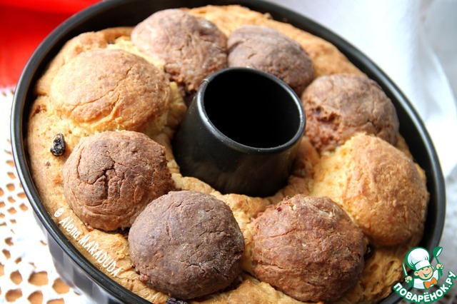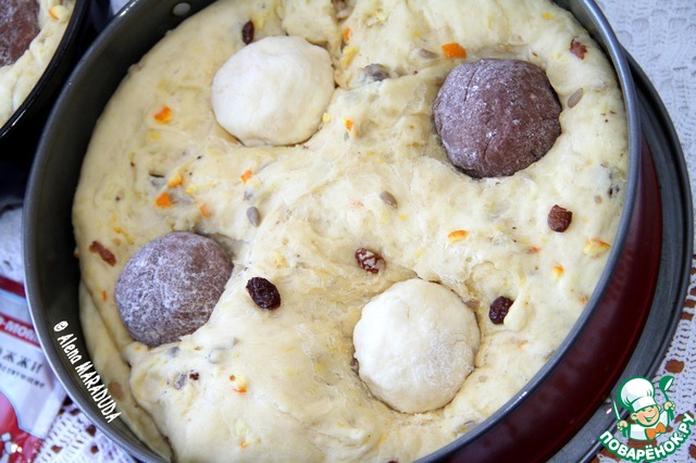Ставим духовой шкаф на предварительный разогрев- на 190-200 °С. В поднявшееся тесто кладем замороженные творожные шарики- чередуя, 8 шариков во второй корж- кольцо и 4 шарика в первый корж. Аккуратно надавливаем на шарики, стараясь их по максимум вдавить в тесто.