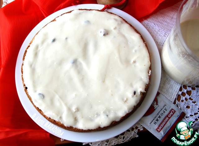 Поливаем аккуратно второй корж сверху оставшимся кремом. Украшаем ягодами черноплодной рябины из варенья.
