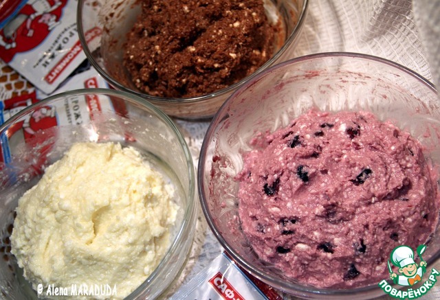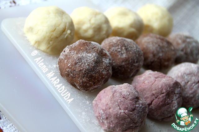 Каждую из трех творожных масс разделяем на 4 части. Раскатываем шарики: в одну ладонь насыпаем немного муки, другой рукой накладываем столовой ложкой творожную массу для шарика, скатываем двумя ладонями.