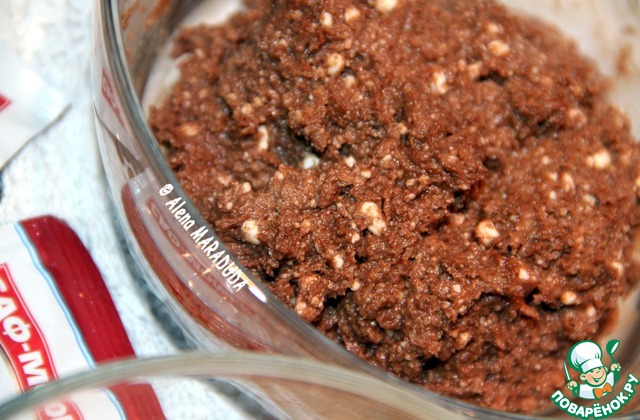 В первую часть добавляем 1 ст. л. какао, на кончике ч. л. корицы и 1 ст. л. сахара. Перемешиваем. Получаем творожную массу для шоколадных шариков.
