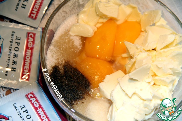 Отделяем желтки от белков. В желтки добавляем 1/2 стак. сахара, 1,5 г ванилина, 1/2 ч. л. кардамона, коньяк или домашнюю спиртовую настойку- 4 ст. л. (на молодых листьях черной смородины, черноплодной рябины, вишни и малины), растительное подсолнечное рафинированное масло- 3 ст. л. и 100 г измельченного мягкого сливочного масла (не растопленного, а именно мягкого!).
