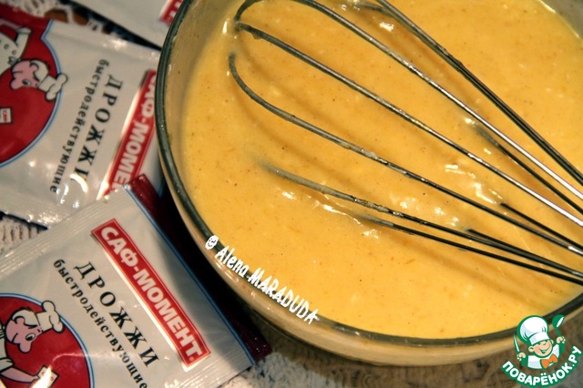 Для начала готовим опару для теста. В молоко комнатной температуры добавляем сухие быстродействующие дрожжи "Саф- Момент" 11 г (для усиления эффекта я использовала быстрорастворимые дрожжи в красной упаковке), 6 ст. л. сахара и 3 ст. л. пшеничной муки, перемешиваем, накрываем, укутывая полотенцем и ставим в теплое место для увеличения объема в 2 раза.