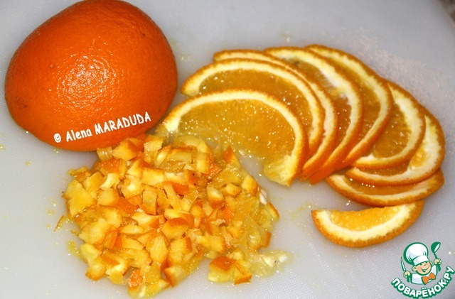 А тем временем подготавливаем добавки для теста. Тщательно моем апельсин теплой водой (все цитрусовые покрывают внешне воском) и мелко нарезаем вместе в цедрой. Сначала пополам, потом на тонкие дольки и измельчаем дольки вдоль.