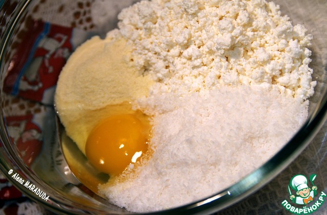 Подготавливаем основу для творожных шариков. Берем 300 г сухого домашнего творога (если творог влажный- отжимаем его через несколько слоев мелкой марли), 100 г кокосовой стружки, 4 ст. л. манки, 1 яйцо, 7 столовых ложек молока и на кончике ч. л. ванилина.
