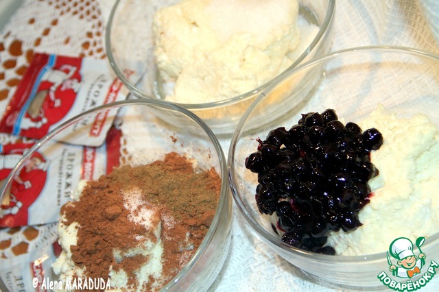 Во вторую часть добавляем 2 ст. л. варенья из черноплодной рябины и 1 ст. л. муки. Перемешиваем. Получаем творожную массу для ягодных шариков.