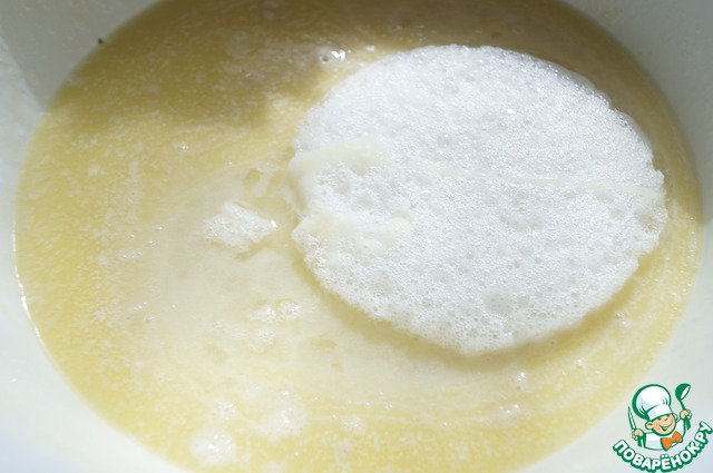 Опару перельем в большую чашу. Желтки разотрем с сахаром, а белки взобьем в пышную пену.