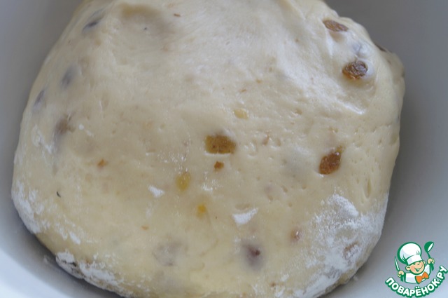 Добавим сюда же распаренный изюм (его заранее заливают горячей водой затем ее сливают), ванилин, корицу и мускатный орех. Перемешаем. Небольшими порциями подсыпим всю муку и замесим нежное гладкое и эластичное тесто. Выложим его в чашу, накроем полотенцем и поставим в теплое место подходить. Как только тесто подойдет обминаем его, затем повторяем эту процедуру еще раз.
