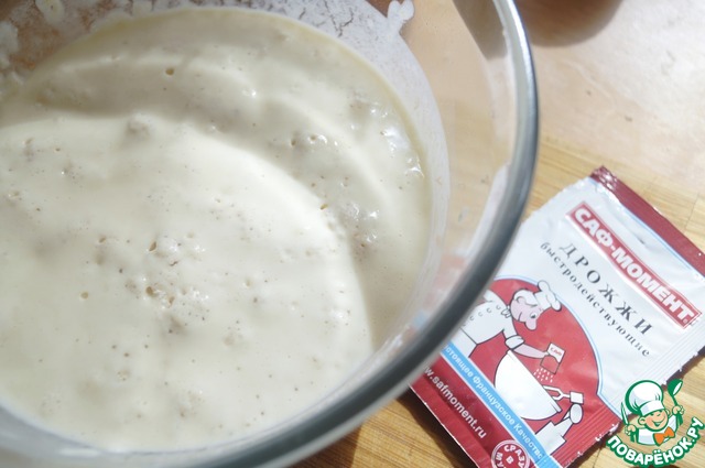 Поставим опару. Молоко подогреем, разведем в нем сахар. Дрожжи сухие ТМ Саф-момент смешаем с мукой и добавим к молоку. Перемешать. Накрыть полотенцем и поставить в теплое место на 30 минут.
