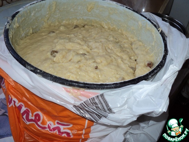 Вторая закладка. Добавить в тесто оставшиеся взбитые яйца с сахаром, масло 150 грамм, изюм с коньяком ( у меня виноград), цедру лимона, 1/2 ч. л. мускатного ореха (приправа в пакетике), добавляем ванилин. Также подсыпаем понемногу просеянную муку. На фото видно какое бродящее и воздушное тесто перед закладкой)))