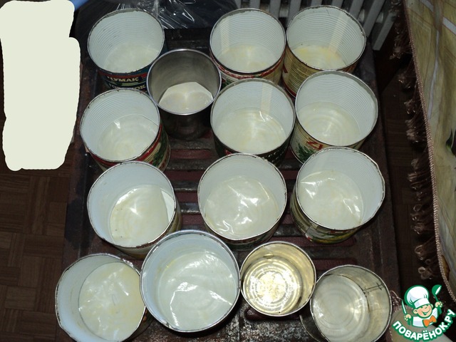 Пока подходило тесто, я подготовила формочки. У меня все достаточно банально, баночки из под горошка, кукурузы, оливок, купленные формочки) Вырезала кружочки, смазала с двух сторон растопленным сливочным маслом и положила на дно баночек и форм для выпечки. Растительное не рекомендую использовать, можно маргарин. Стеночки лучше не мазать маслом. А еще лучше использовать бумажные формы из магазина, стоят копейки и мороки меньше, но, я опять же не успела их купить!