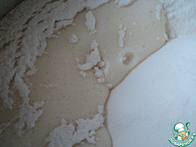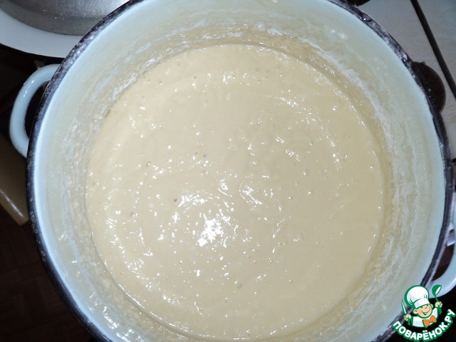Первая закладка. В опару всыпаем 4-5 стаканов просеянной муки, третью часть взбитых яиц, всю домашнюю сметану 300 грамм и половину 150 грамм сливочного масла. Тщательно мешаем, я делаю это венчиком. Тесто как жидкая сметана, может еще жиже. Запах уже пошел) Накрываем полотенцем и ставим в теплое тихое место на час-полтора. Я ставила опять же в духовку, предварительно немного подогретую, теплую. Вот такое чудо получается.