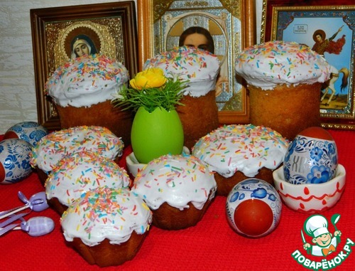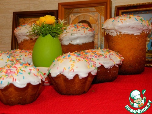 Готовые куличи покрываем глазурью и посыпаем украшением. В этот раз я использовала готовую покупную глазурь.