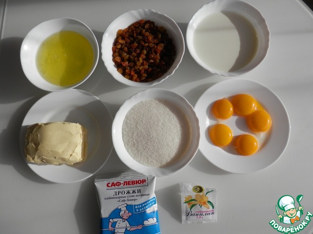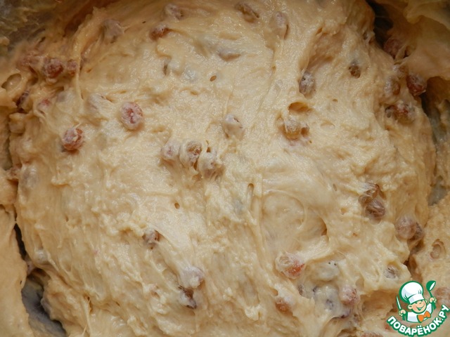 Изюм замочить на пару часов, слить воду, обсушить и посыпать мукой. Добавляем изюм в подошедшее тесто и еще раз аккуратно перемешиваем.