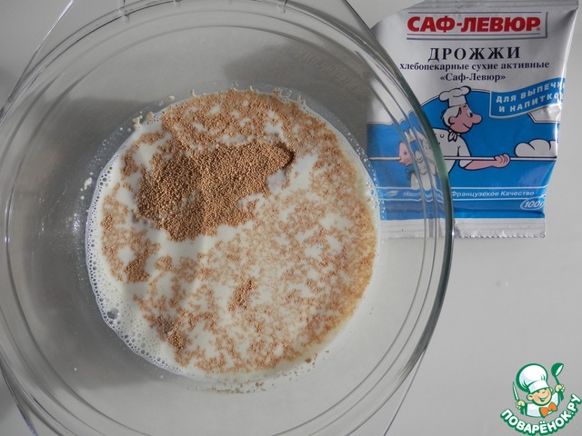 Теплое молоко смешать с сухими дрожжами САФ-ЛЕВЮР и 0.5 кг муки. Подождать чтоб опара подошла (увеличилась в 2 раза)