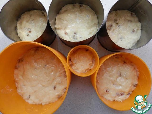 Раскладываем тесто в смазанные маслом формочки и даем еще раз подойти. Ставим в разогретый до 180° духовой шкаф и выпекаем 30-40 мин. Если сверху тесто быстро румянится, то накрываем пергаментом.
