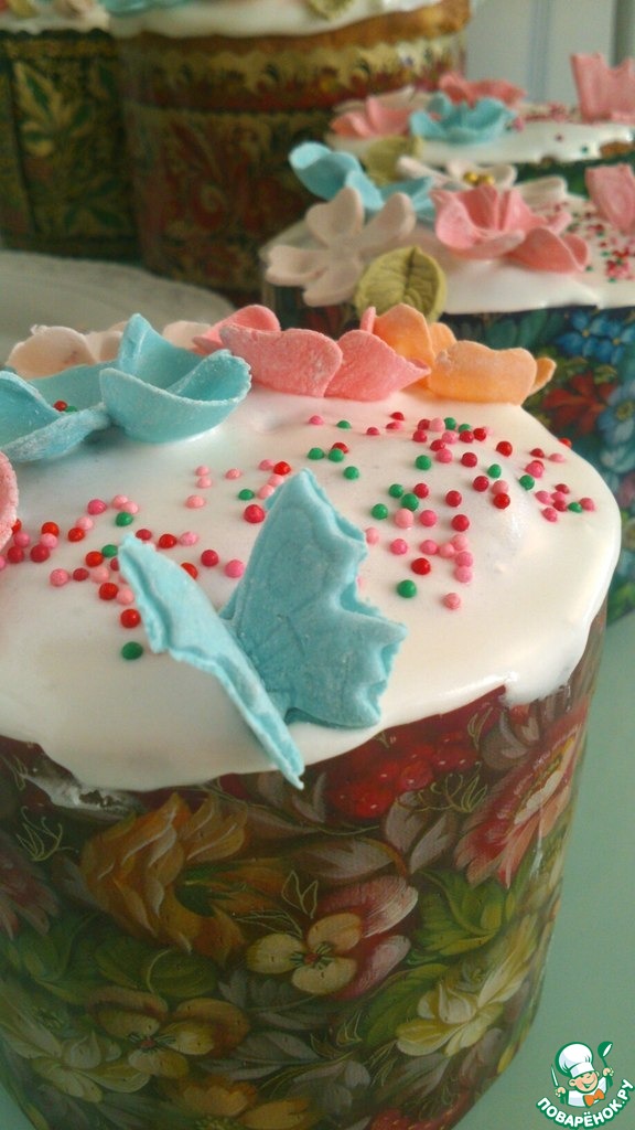 Готовые и остывшие куличи смазать глазурью (взбить белок и сахарную пудру) и украсить мастичными цветочками.