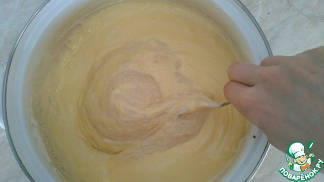 Взбить белки с сахаром. Добавить соль, ваниль, опару и вымесить до однородности.