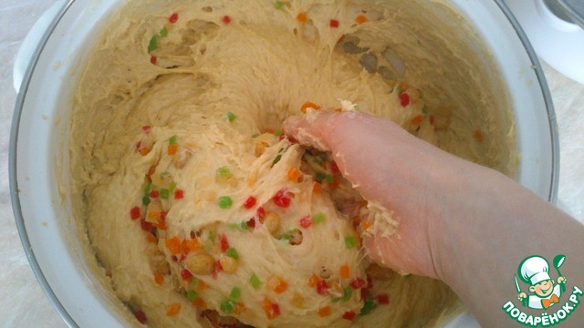 Вмесить сухофрукты до равномерного распределения и оставить тесто для брожжения на 2-2.5 часа (через час его нужно обмять).